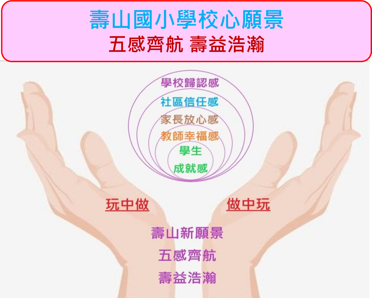 以成就感、幸福感、放心感、信任感、歸認感為「五感齊航」,學生、教師、家長、社區、學校皆能「壽益浩瀚」。